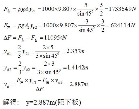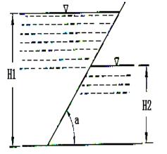 - 简答题 一矩形闸门两面受到水的压力,左边水深H1=5m,右边水深H2=3m,闸门与水平面成α=45°倾斜角,如图所示。假设闸门的宽度b=1m,试求作用在闸门上的总压力及其作用点。