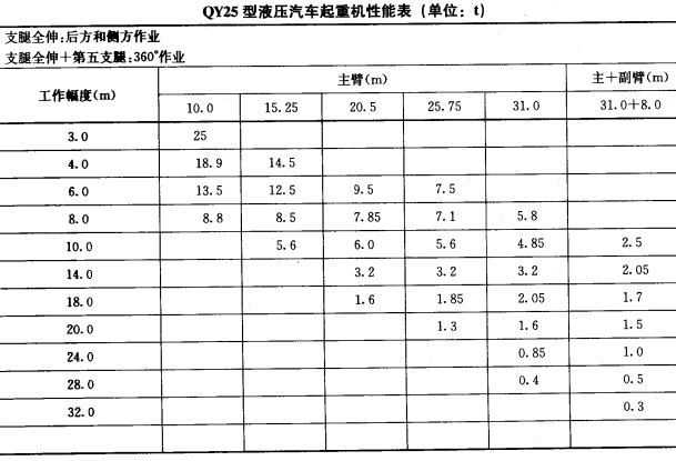 工地上有一台设备需要吊装。设备运输、吊装重量5000kg,外形尺寸(长×宽×高)为4521×1015×2112。设备安装在二楼平台上,二楼楼面标高为6m。工地土质为硬质黏土,建筑物四周无障碍物。请根据附表图"QY25型液压汽车起重机性能表",合理选择起重机工况。