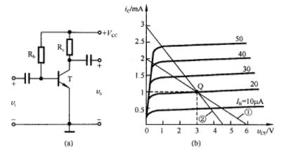 (1)由图解法可知,直流负载线与输出特性横坐标轴的交点的电压值即是VCC值的大小,由图(b),读得Ib≈20μA,VCC≈6V。由Q点分别向横、纵轴作垂线,得IC=1mA,VCE=3V。