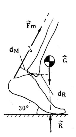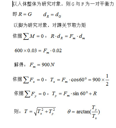 - 简答题 某人单腿站立时,G=600N,dM=2cm,dG=3cm,如图,Fm与水平呈60°