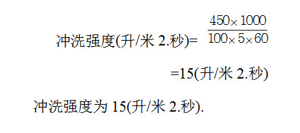 - 简答题现有一滤池面积100m2,冲洗时间5分种,冲洗水量450m3,求该滤池冲洗强度?