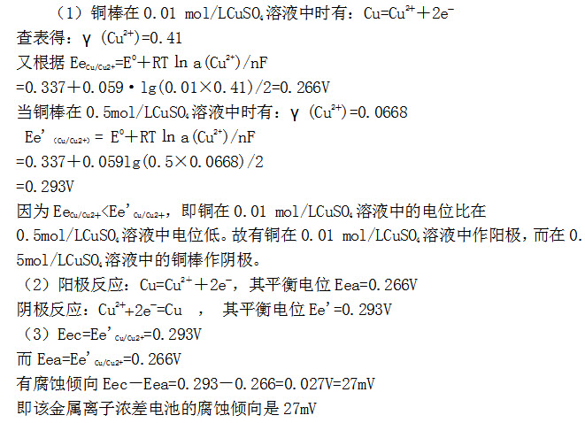 - 简答题 将两根铜棒分别浸于0.01mol/L,CuSO4溶液和0.5mol/L,CuSO4溶液,组成一个金属离子浓差电池。 (1)哪一根铜棒是阳极,哪一根铜棒是阴极? (2)写出阳极反应和阴极反应,计算其平衡电位。 (3)该金属离子浓差电池的腐蚀倾向是多少伏?