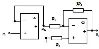 - 简答题 下图所示是由两个运算放大器组成的运算电路。已知输入电压ui = - 1V, 试求出输出电压uo的值。