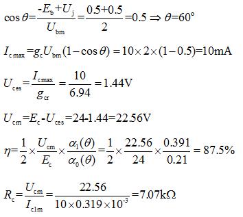 - 简答题 已知谐振功率放大器工作在临界状态,晶体管转移特性的斜率g=10ms,Uj=0.5V,Eb=-0.5V,Ubm=2V,晶体管输出特性临界饱和线斜率gcr=6.94A/V,Ec=24V。 求(1)集电极效率ηc; (2)集电极负载谐振电阻Rc?