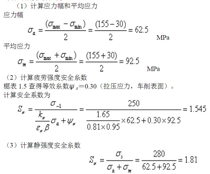 由上述计算结果可知,该零件的疲劳强度和静强度安全系数均大于许用安全糸数[S]=1.5,故零件强度足够。