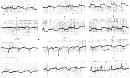 - 单项选择题患者,男,60岁,突然感到心前区闷痛,伴心悸3小时,自服硝酸甘油1片,疼痛未能缓解。做心电图检查,显示如图所示: