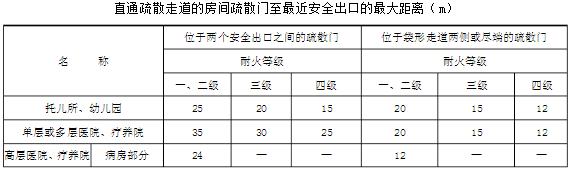 2.直通疏散走道的房间疏散门至最近未封闭的楼梯间的距离,当房间位于两个楼梯间之间时,应按表的规定减少5m;当房间位于袋形走道两侧或尽端时,应按表的规定减少2m。