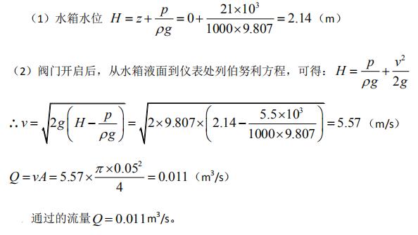 - 简答题水管直径50mm,末端阀门关闭时,压力表读值为21kN/m2。阀门打开后读值降至5.5kN/m2,如不计水头损失,求通过的流量。