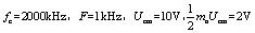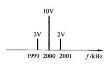 - 简答题 如图所示为载频是2000kHz的调幅波频谱图。写出它的电压表达式,并计算它在负载R=1Ω时的平均功率和有效频带宽度。