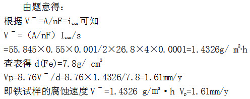 - 简答题表面积4cm2的铁试样,浸泡在5%盐酸溶液中,测出腐蚀电流为Icor=0.55mA。计算铁试样的腐蚀速度V- 和VP。
