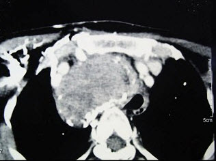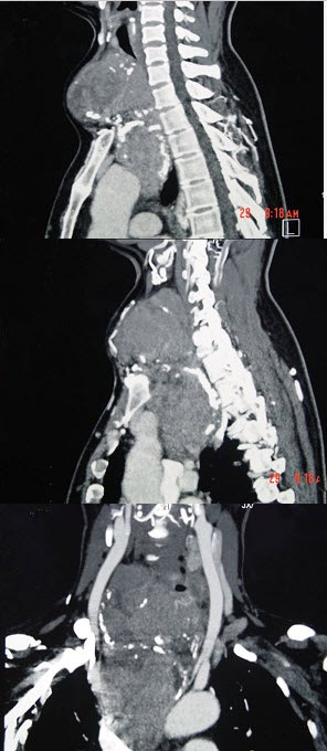 - 多项选择题女性,48岁,颈部包块3年,近来胸闷、憋气、胸痛,CT扫描如图,请选择正确的描述和答案()。