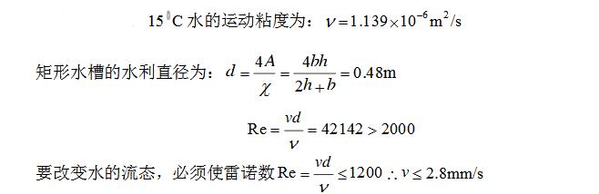 - 简答题温度t=15°C的水在宽度b=0.4m的矩形水槽中流动。当水深h=0.3m,速度v=10cm/s时,求此时的雷诺数。若水深不变,速度为多少时变为层流。