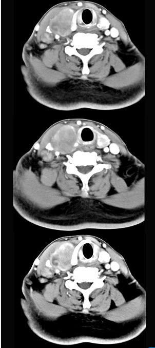 - 多项选择题女性,54岁,右侧颈部肿大近1年,近来病人有声嘶、吞咽困难,CT扫描如图,请选择正确的描述和答案()。