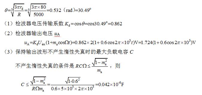 。试求: (1)检波器电压输入系数Kd (2)电压uA; (3)保证输出波形不产生惰性失真时的最大负载电容C?