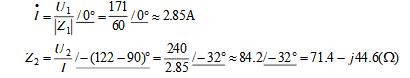由相量图可看出,由于Z2端电压滞后于电流,所以推出阻抗Z2是一个容性设备,又由Z1=j60Ω可知,Z1是一个纯电感元件,设电路中电流为参考相量,则