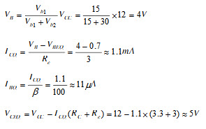 - 简答题 放大电路如图所示,已知图中VCC=+12V,Rbl=15kΩ,Rb2=30kΩ,Re=3kΩ,Rc=3.3kΩ,β=100,VBE=0.7V,电容C1、C2足够大。 (1)计算电路的静态工作点IBQ、ICQ和VCEQ。 (2)分别计算电路的电压放大倍数