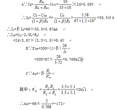 - 简答题 已知分压式偏置放大电路中,UCC=24V,RC=3.3kΩ,RE=1.5kΩ,RB1=33kΩ,RB2=10kΩ,RL=5.1kΩ,β=66。设UBE≈0,RE并联旁路电容CE。 试求: A、静态值IB、IC、UCE。 B、晶体管输入电阻rbe。 C、电压放大倍数Au。