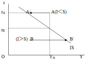 在IS曲线的右侧,如A点,I<S,因为在A点的利率rA高于产品市场的均衡利率rE,即rA>rE,说明IA<IE,而均衡条件为IE=S,所以在A点有I<S;同理,在IS曲线的左侧,如B点,则有I>S。 关注下方微信公众号,在线模考后查看