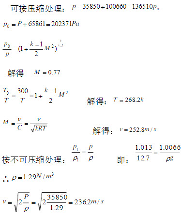 - 简答题毕托管测得静压为35850N/m2(r)(表压),驻点压强与静压差为65.861kPa,由气压计读得大气压为100.66kPa,而空气流的滞止温度为27℃。分别按不可压缩和可压缩情况计算空气流的速度。