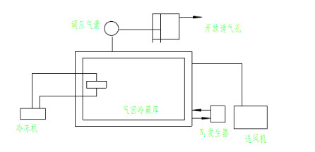 (1)工作原理:在气密的库房里,依靠蔬菜自身的呼吸来降低氧气和增加二氧化碳,根据气体成分分析结果,用开(关)送风机控制氧气,开(关)洗涤器控制二氧化碳。用这种方法降低氧气和增加二氧化碳较慢,且对冷藏库的气密性要求较高,不宜在储藏期间出库或观察,适宜一次性进出的产品,所需费用最低。