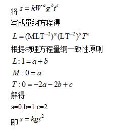 - 简答题试根据物理方程的量纲一致性原则,确定位移s与重力W、重力加速度g、以及时间t的关系表达式中各项指数a,b,c的值。表达式为s=kWagbtc,其中k为常数。