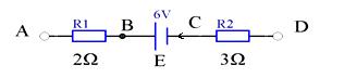 - 单项选择题 在下图所示的电路中,R1=2ΩR2=3ΩE=6V,内阻不计,I=0.5A,当电流从D点流向A点时,则UAC为()。