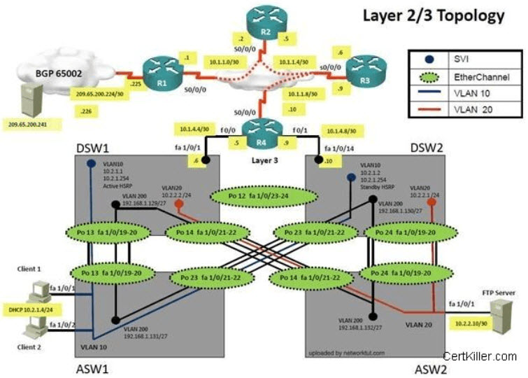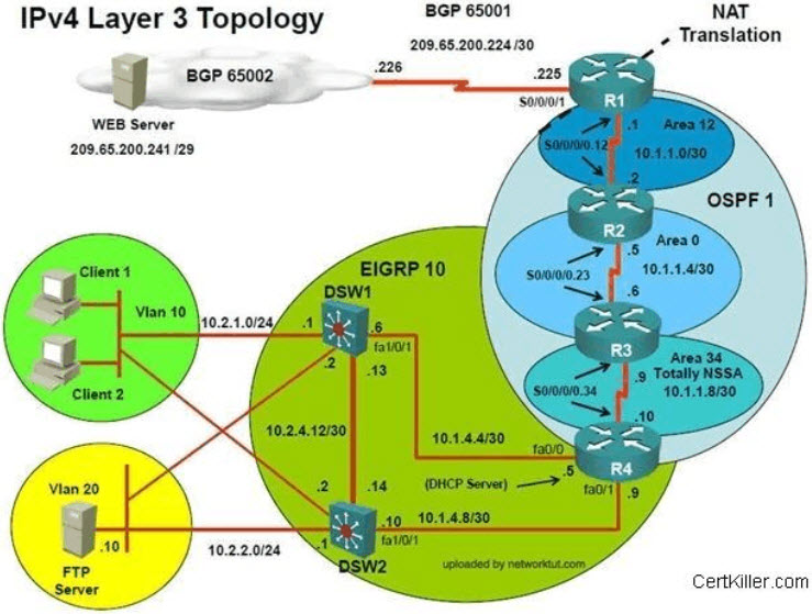 Figure 2 Trouble Ticket Statement Client 1 is not able to reach the WebServer. Initial troubleshooting shows that DSW1 can ping the Fa0/1interface of R4 but not the s0/0/0/0.34 interface. Configurationon DSW1 router eigrp 10 network 10.1.4.4 0.0.0.0 network 10.2.1.1 0.0.0.0 network 10.2.4.13 0.0.0.0 no auto-summary Configurationon DSW2 router eigrp 10 network 10.1.4.8 0.0.0.0 network 10.2.2.1 0.0.0.0 network 10.2.4.14 0.0.0.0 no auto-summary Configurationon R4 router eigrp 10 network 10.1.4.5 0.0.0.0 no auto-summary redistribute ospf 1 metric 100 10 255 1 1500 route-map EIGRP_to_OSPF ! router ospf 1 network 10.1.1.8 0.0.0.0 area 34 redistribute eigrp 10 subnets! route-map EIGRP→OSPF match ip address 1! access-list 1 permit 10.0.0.0 0.255.255.255 access-list 1 permit 209.0.0.0 0.255.255.255 The Fault Condition is related to which technology?() A、EIGRP