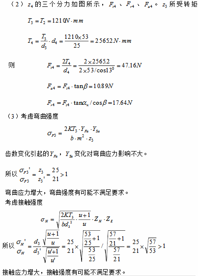 (1)为使轴Ⅱ的轴承所受轴向力较小,试确定齿轮Z4的螺旋角方向; (2)计算齿轮Z4的三个分力大小(忽略摩擦力),并在图上画出这三个分力的方向; (3)在箱体结构和其他条件不变的情况下,仅将Z3减小到Z3=21,将Z4增大到Z4=57,以得到更大的减速比,若传递功率不变,试分析可能会出现什么问题?简要说明理由。