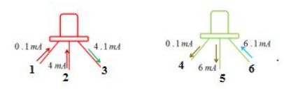 - 简答题根据下图判断管子的类型和材料以及引脚,并计算电流放大倍数β,画出相应的三极管符号。