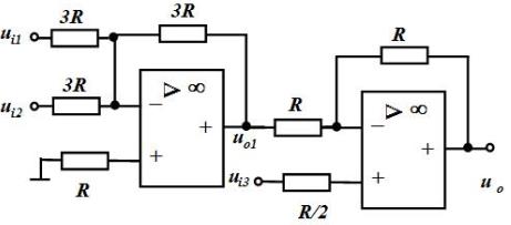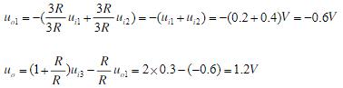 - 简答题 下图所示是利用两个运算放大器组成的两级运算电路,已知ui1=0.2V,ui2=0.4V,ui3 = 0.3V, 试求输出电压uo的值。