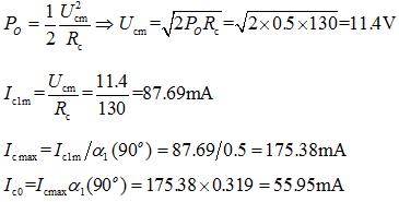 - 简答题 有一谐振功率放大器,已知晶体管的gc=2000ms,Uj=0.5V,Ec=12V,谐振电阻Rc=130Ω,集电极效率ηc=74.6%,Po=500mW,θ=90°,且工作于欠压状态。试求:Ucm,Ic1m,Ic0,Icmax?