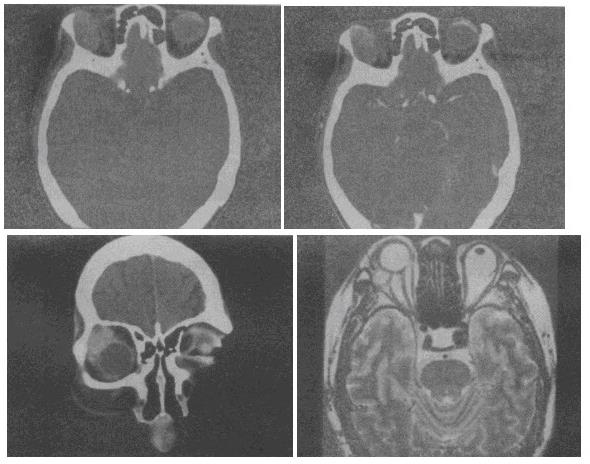 - 单项选择题 男,41岁,右侧眼眶外上方肿胀,可触及无痛性包块,CT及MRI检查如图,最可能的诊断是()。