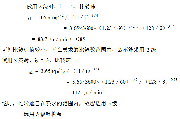 - 简答题某水泵以转速n为3600r/min旋转时,相对应的扬程H为128m,流量qV为1.23m3/min,为满足该流量,拟采用比转数ns为85~133范围的单吸多级泵,试确定所用泵叶轮的级数?