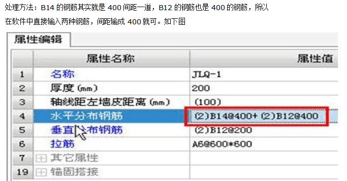 - 简答题如果剪力墙中水平筋中图纸规定:B14和B12钢筋以200的间距布置,如何处理?