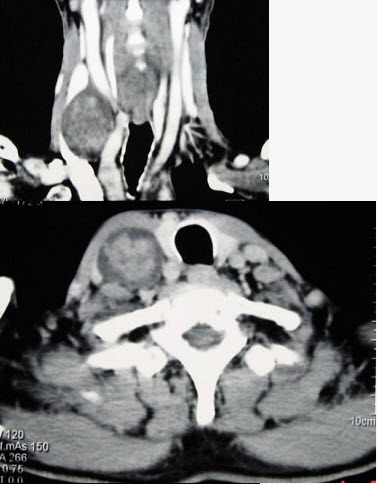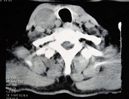 - 女,56岁,发现颈部肿块一月余,CT如图