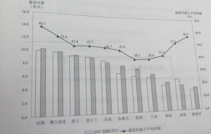B、2012年与2007年相比,图中国家的最低时薪均有所增加