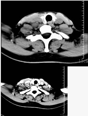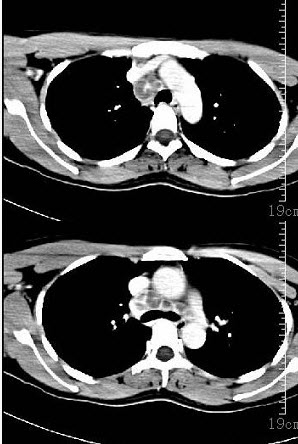 - 女性,48岁,颈部包块3年,近来胸闷、憋