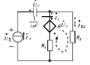 - 简答题 下图所示电路中,IS=10A,ω=5000rad/s,R1=R2=10Ω,C=10μF,μ=0.5。求各支路电流,并作相量图。
