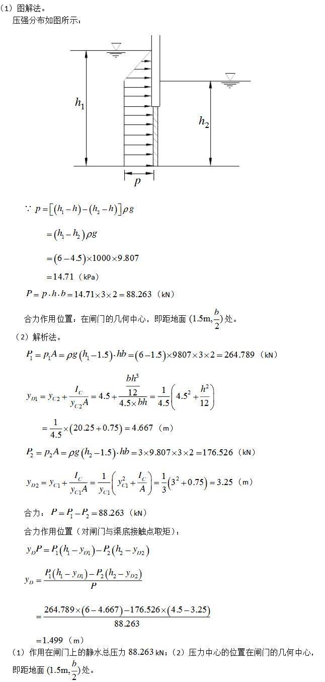 - 简答题矩形闸门高h=3m,宽b=2m,上游水深h1=6m,下游水深h2=4.5m,试求: (1)作用在闸门上的静水总压力; (2)压力中心的位置。