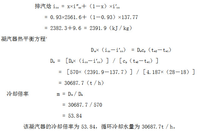 - 简答题一台容量为300MW的汽轮机,已知其凝汽器内的压力为pco=5kPa,排汽进入凝汽器时的干度x=0.93,排汽的质量流量Dm=570t/h,若凝汽器冷却水的进出口温度分别为18℃和28℃,水的平均定压质量比热cp=4.187kJ/(kg·℃)。排汽压力下的饱和水焓i′co=137.77kJ/kg,饱和蒸汽焓i″co=2561.6kJ/kg。试求该凝汽器的冷却倍率和循环冷却水量。
