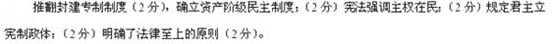 - 简答题 材料一1791年宪法节选 ……主权是统一的、不可分的、不可剥夺的和不动移的;主权属于国民;任何一部分人民或任何个人皆不得擅自行使之。 ……政府是君主制;行政权委托给国王,在他的统辖之下由部长和其他负责官员按照下面所定的方式行使之。 ……在法国,没有比法律的权力更高的权力;国王只能根据法律来治理国家,并且只有根据法律才得要求服从。 ——吴绪等选择《十八世纪末法国资产阶级革命》 材料二十九世纪在世界各个角落里只是做了一件事情,就是实行了、分别地实现了、做到了伟大的法国资产阶级革命家们所创始的事情……任何一个自觉地对待历史的人都会说,法国革命虽然被粉碎了,但它毕竟是胜利了,因为它为全世界奠定了曾是无法消灭的资产阶级民主、资产阶级自由的基石。 ——列宁《关于用自由平等口号欺骗人民》(1919年5月) 根据材料一、二,分析法国革命怎样奠定了资产阶级民主自由的基石?(10分)