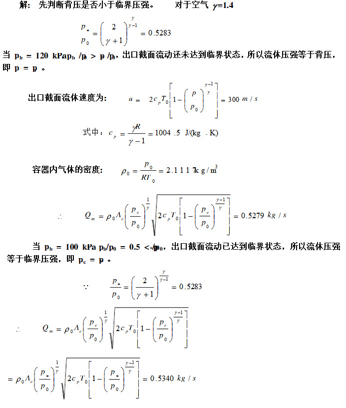 - 简答题空气自大容器经收缩喷管流出,容器内流体压强 p0=200kPa,温度 T0=330K,喷管出口截面面积为12cm2。求出口外背压分别为pb=120kPa和pb=100kPa时的喷管质量流量 Qm