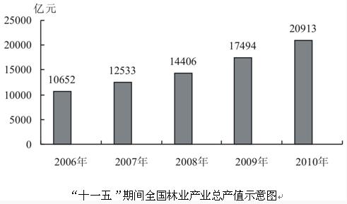 - 单项选择题2010年全国林业产业总产值达到2.09万亿元,与2009年相比增长19.55%,保持较高增速,林业产业全面复苏,其中第一、二、三产业产值分别为7901亿元、11123亿元和1889亿元,三次产业结构比为37.8:53.2:9.0,结构进一步合理。