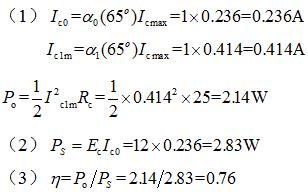 - 简答题 已知一高频放大器,Ec=12V ,负载谐振电阻Rc=25 Ω,其集电极脉冲电流的参数Icmax=1A,θ=65° ,α0(65°)=0.236,α1(65°)=0.414。试计算 P0,PS,ηc。