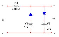 - 简答题假设二极管为理想器件, 画出下面电路中与输入波形相对应的输出波形。