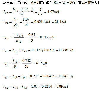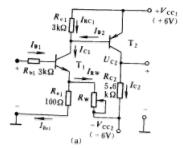- 简答题 一个直接耦合两级放大电路如图(a)所示。晶体管Tl和T2均为硅管,β1=β2=50,VBE=0.65V。调节Rw后使输入信号Vi=0时,Vc2=0V。求: (1)各级静态工作点Q及Rw阻值。 (2)Av、Ri和Ro。