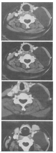 - 单项选择题 男,40岁,颈部出现无痛性囊性包块2年余,CT扫描如图所示,最可能的诊断是()。