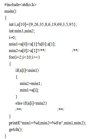 - 简答题 补充程序Ccon0210.C,该程序的功能是找出数组中的最小数min1和次小数min2。