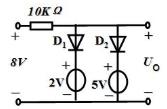 - 单项选择题 在下图所示的电路中,U0为()。其中,忽略二极管的正向压降。