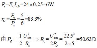 - 简答题 某谐振功率放大器,已知Ec=24V,输出功率Po=5W,晶体管集电极电流中的直流成分Ic0=250mA,输出电压Ucm=22.5V,试求:直流电源输入功率Ps;集电极效率ηc;谐振回路谐振电阻Rc?